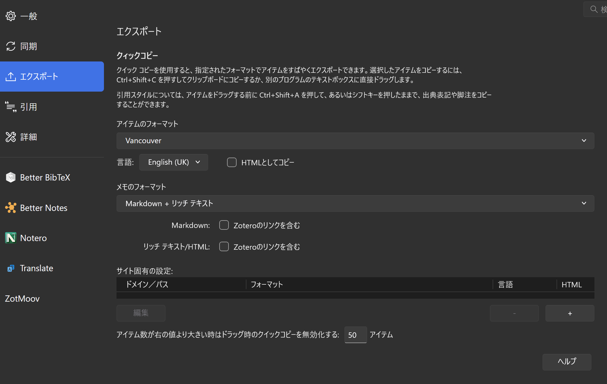 Better BibTeXの公式サイトから導入したあとに以下スクショのように設定します。(以下はデフォルト)