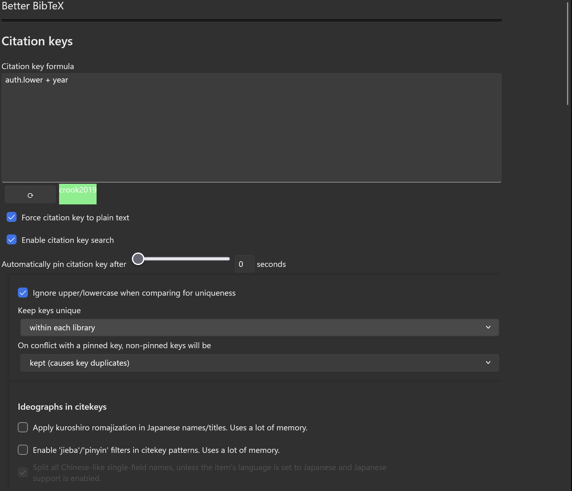 他にもテキストを入力したりまあまあの拡張性があるのでCitation keyの設定方法を見ながら使いやすいようにいじってみてください。